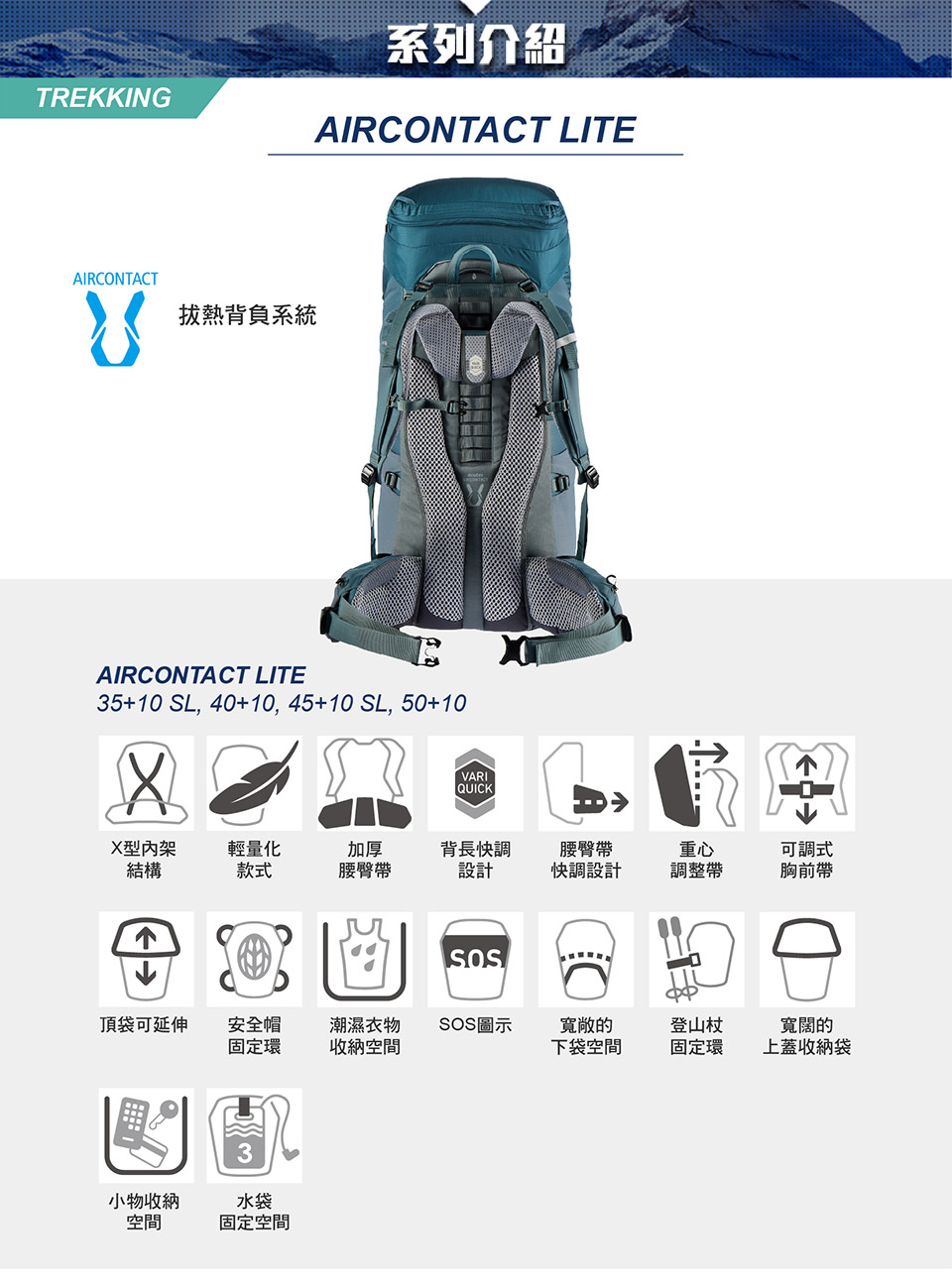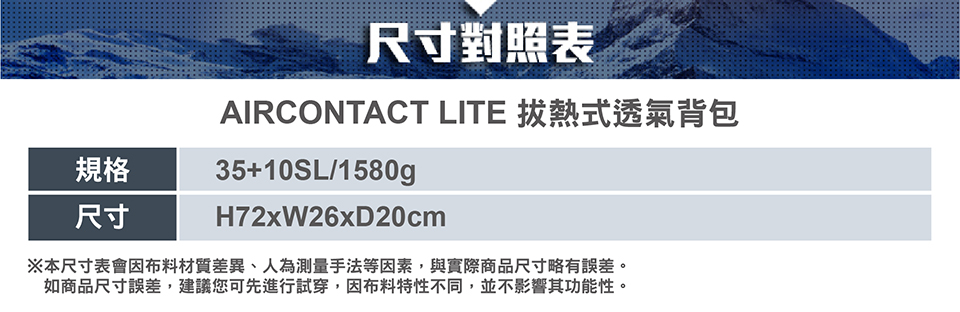 AIRCONTACT LITE拔熱式透氣登山背包/女性窄肩款/百岳登山包