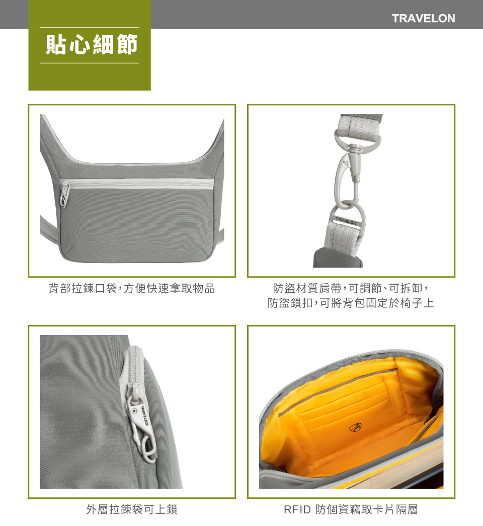可調式肩帶具有鎖定扣具,可將您的包固定在任何椅背或固定物體上