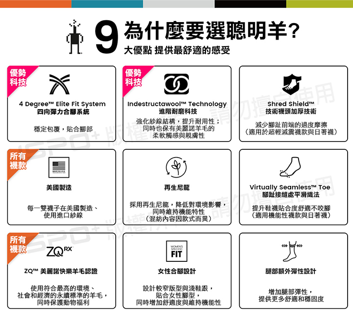 • Indestructawool™ 進階耐磨技術,提高耐用度與舒適性 • 4 Degree™ elite 四向彈力伸縮合腳系統,穩定包覆與貼合 • Virtually Seamless™ 無縫線平織襪頭,提高舒適度、不咬腳 • 網狀透氣區塊增加透氣度 • 優化彈性襪口,舒適貼合不壓迫