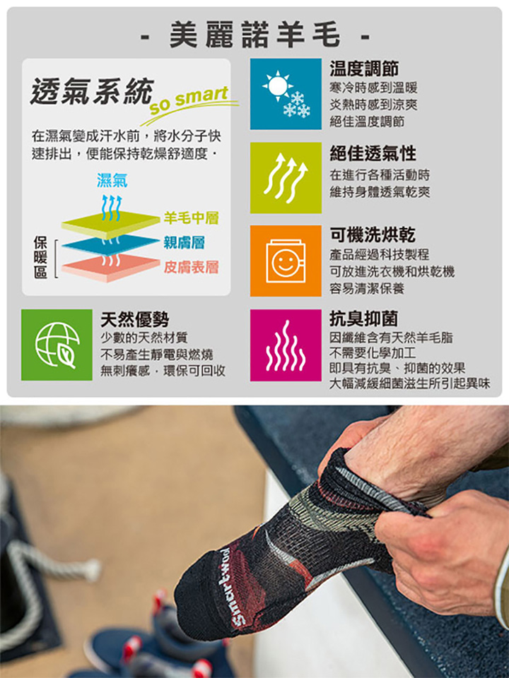 • Indestructawool™ 進階耐磨技術,提高耐用度與舒適性 • 4 Degree™ elite 四向彈力伸縮合腳系統,穩定包覆與貼合 • Body-mapped 網狀透氣區塊增加透氣度